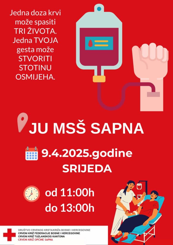 Akcija dobrovoljnog darivanja krvi održat će se u prostorijama Mješovite srednje škole “Sapna” u periodu od 11 do 13 sati.