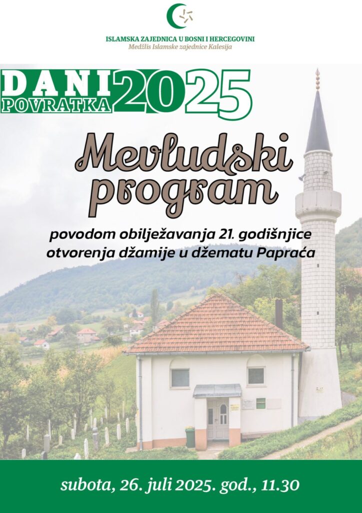 U subotu, 26. jula 2025. god., prije podne-namaza sa početkom u 11:30 sati, biće izveden mevludski program povodom obilježavanja 21. godišnjice otvaranja džamije u Papraći.