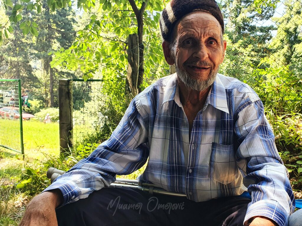 “Ove godine prilazim da ga selamim, po običaju tražim dozvolu kao i svaki put da ga fotografišem. Priča mi kako mu je prije dvije godine prišao mladić i htio da mu pokaže fotografiju od predhodne godine kako ga je fotografisao, ali da nije uspio pronaći istu. Kada sam mu rekao da sam to bio ja, pitao me odakle sam. Bilo mu je drago što smo tako blizu, takoreći “komšije” i što mu se svaki put javim kada prolazim. Ove godine je bio sa štakama, sjedeći na stolici u odnosu na prethodne godine. Hadžiji sam poželio da ga zdravlje posluži i da se ako Bogda do godine vidimo opet, selamili smo se, te sam nastavio dalje trasom Marša mira do Srebrenice.”Marš mira – Put sjećanja. Kamp Liplje, 8. juli 2021.
