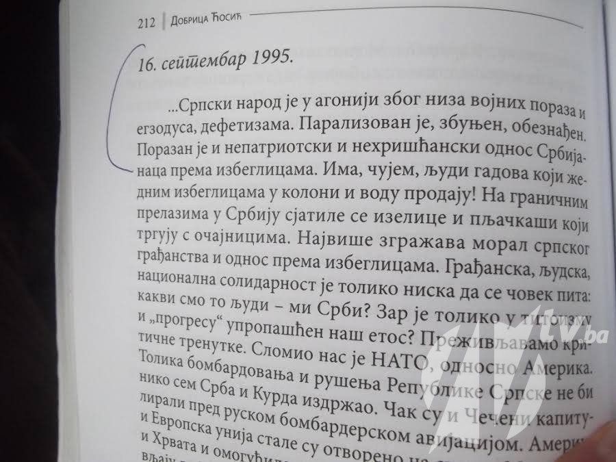 – Srpski narod je u agoniji zbog niza vojnih poraza i egzodusa, defetizama. Paralizovan je, zbunjen, obeznađen. Porazan je i nepatriotski i nehrišćanski odnos SRBIJANACA prema izbeglicama. Ima, čujem, ljudi gadova koji žednim izbeglicama u koloni i vodu prodaju! – piše Dobrica Ćosić (Bosanski rat, 2. izdanje, izdavač “Službeni glasnik”, Biblioteka Posebna izdanja, Beograd 2012. godine).