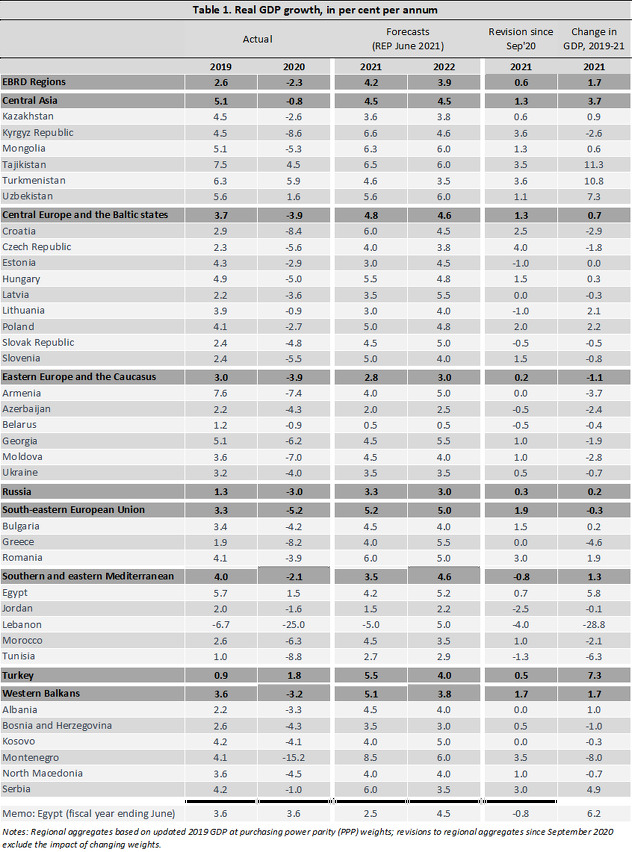Za regiju zapadnog Balkana, EBRD očekuje ekonomski rast od 5,1 posto u 2021. i 3,8 posto u 2022. godini. EBRD je prognozirao da će rast BDP-a Crne Gore u 2021. godini iznositi 8,5 posto, Hrvatske i Srbije po 6, Slovenije za 5, Albanije 4,5, te Sjeverne Makedonije i Kosova po 4 posto.