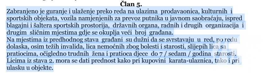 Na mjestima iz predhodnog stava građani su dužni da se svrstavaju u red, po redu dolaska, osim težih invalida, lica nemoćnih zbog bolesti i starosti, slijepih lica sa pratiocima, očigledno trudnih žena i pratioca djece do 7 / sedam / godina starosti. Licima iz stava 2. mora se dati prednost kako pri kupovini karata-ulaznica, tako i pri ulasku u objekte.