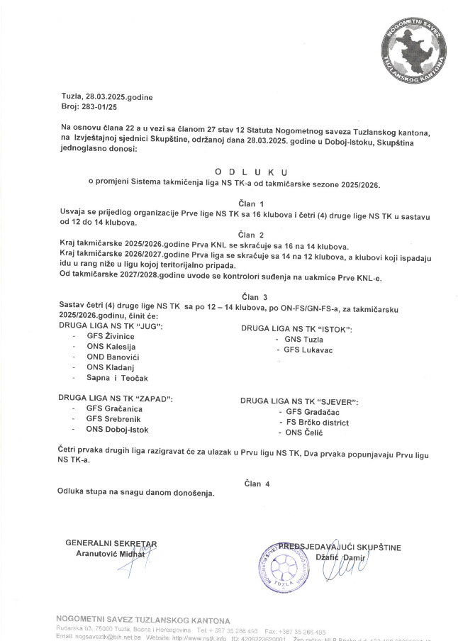 Delegati Skupštine jednoglasno su usvojili prijedlog novog formata takmičenja. Tako će Prva liga TK od naredne sezone 2026/27 brojati ukupno 14 klubova. Sa druge strane od postojeće tri napravit će se četiri druge lige. Savez uvodi nagrade za sve prvake liga. Između ostalog usvojen je Izvještaj o radu saveza sa finansijskim izvještajem za 2024. te Plan rada saveza sa finansijskim planom za 2025. godinu. Skupština je jednoglasno usvojila izvještaje o radu pravnih Komisija NS TK.
