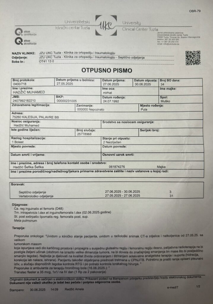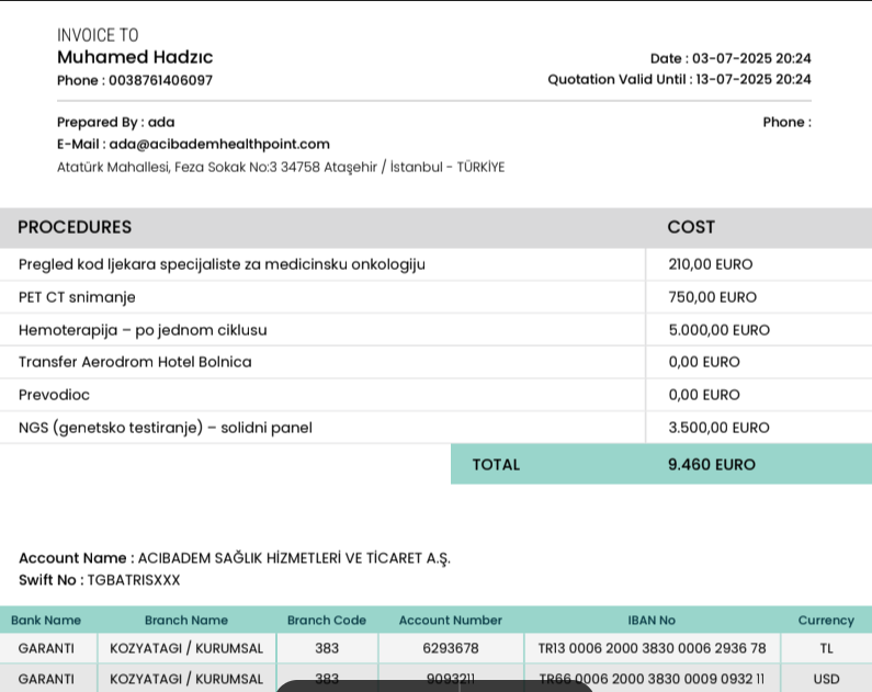 Nadu za oporavak pruža klinika Acibadem u Istanbulu, Turska, gdje je predviđen nastavak liječenja. Međutim, troškovi liječenja, pregleda, terapija i boravka u inostranstvu višestruko premašuju finansijske mogućnosti Muhameda Hadžića koji živi sa majkom Šefikom Hadžić.