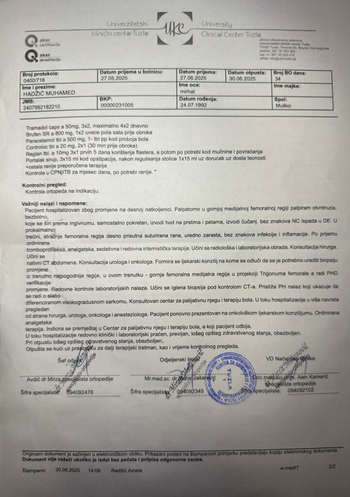 U aprilu ove godine Muhamed je podvrgnut operativnom zahvatu, nakon kojeg je njegovo zdravstveno stanje naglo pogoršano. Naknadnim ispitivanjima ljekari su, nažalost, konstatovali karcinom. Bolest je agresivna i zahtijeva hitno i specijalizirano liječenje.