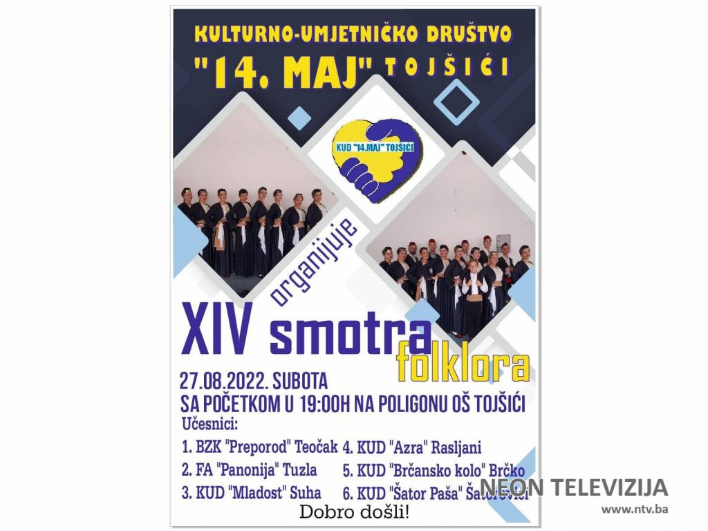 KUD “14. maj” Tojšići organizuje 14. smotru folklora. Smotra folklora održat će se u subotu, 27.8.2022. godine sa početkom u 19:00 sati na poligonu. Osim domaćina nastupit će još 7 kulturno-umjetničkih društava: