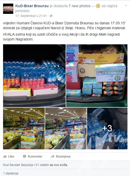 KUD “Biser” džemata Braunau su donirali, za izbjeglice u teškom fizičkom, psihičkom i materijalnom stanju iz Sirije, hranu piće i higijenski materijal.