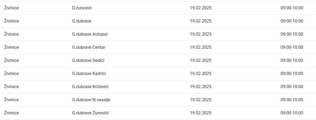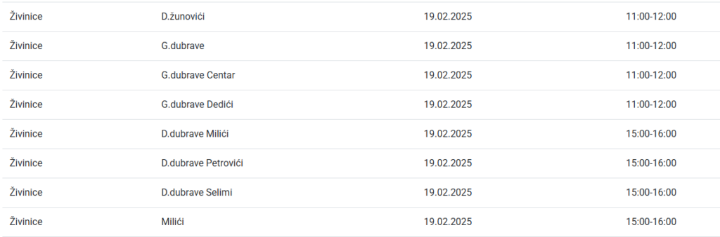 U nekoliko živiničkih naselja sutra (19. februar) će doći do privremene obustave isporuke električne energije. Riječ je o jednosatnim prekidima u periodima od 9 do 10, 11 do 12, te od 15 do 16 sati.