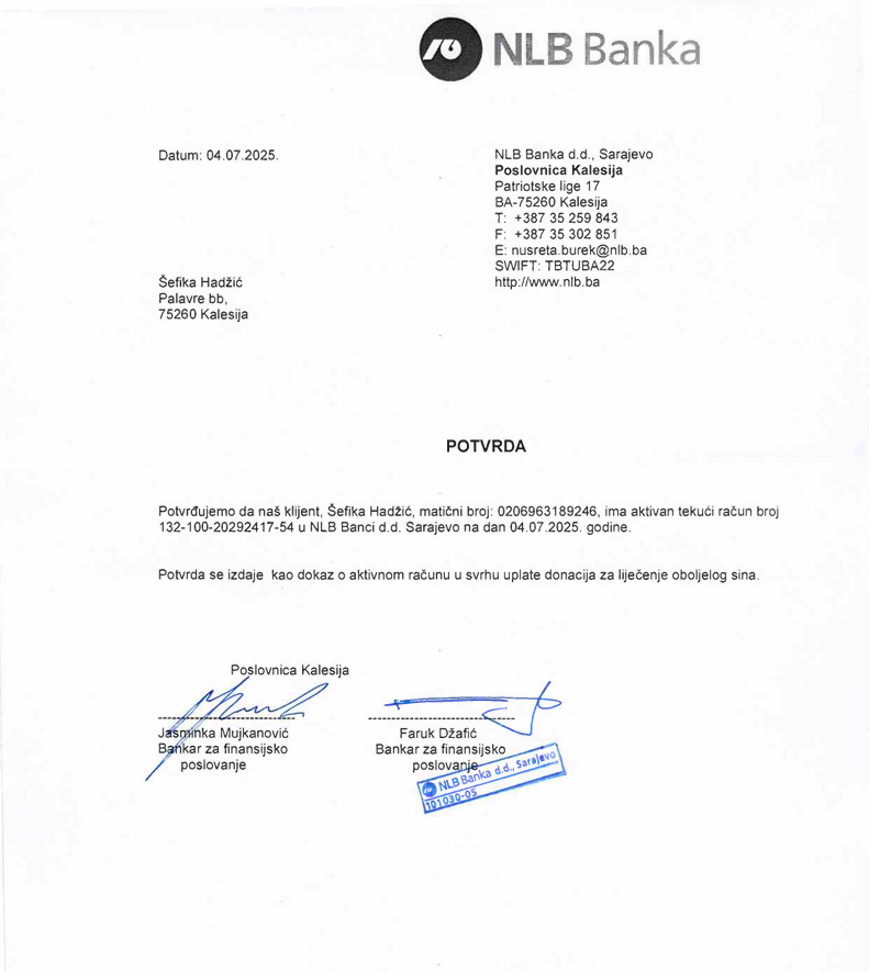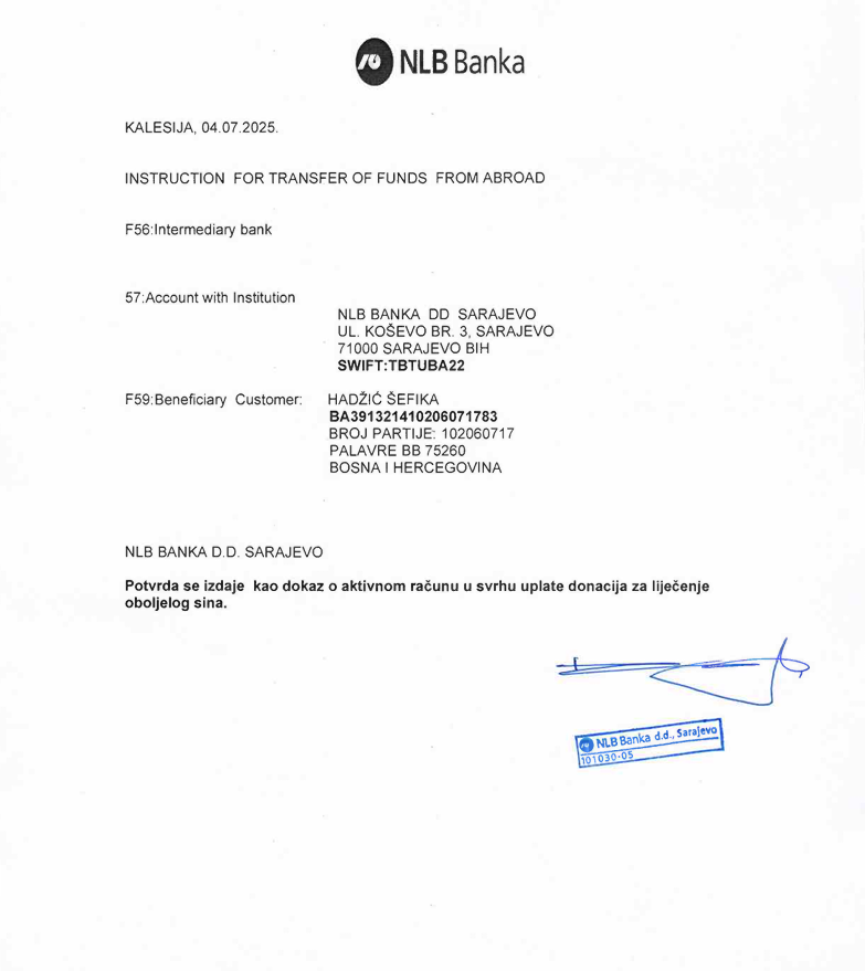 Podsjećamo, Muhamed Hadžić iz Kalesije ima 32 godine i trenutno vodi najtežu bitku. Onu za život. U aprilu ove godine Muhamed je podvrgnut operativnom zahvatu, nakon kojeg je njegovo zdravstveno stanje naglo pogoršano. Naknadnim ispitivanjima ljekari su, nažalost, konstatovali karcinom. Bolest je agresivna i zahtijeva hitno i specijalizirano liječenje. Nadu za oporavak pruža klinika Acibadem u Istanbulu, Turska, gdje je predviđen nastavak liječenja. Međutim, troškovi liječenja, pregleda, terapija i boravka u inostranstvu višestruko premašuju finansijske mogućnosti Muhameda Hadžića koji živi sa majkom Šefikom Hadžić.