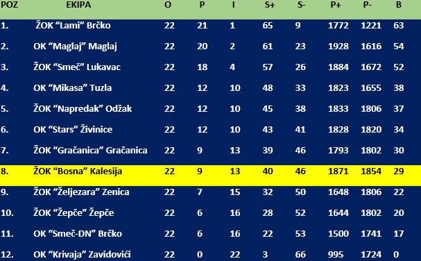 Kada je u pitanju tabela, ŽOK “Bosna” sezonu završava kao osmoplasirana ekipa Superlige FBiH – sjever. Bosna je u ovoj sezoni ostvarila bilans od 9 pobjeda i 13 poraza uz negativan set količnik -6 (40:46), te pozitivan poen količnik +17 (1871:1854). Tokom sezone je bilo dosta oscilacija u igri kalesijskih odbojkašica što je posve razumljivo i očekivano budući da se radi o veoma mladoj ekipi, jednoj od najmlađih u Superligi. Ono što treba da raduje je činjenica da ova mlada ekipa ima kvalitet, te da u budućnosti od ove ekipe možemo očekivati dosta bolje rezultate.