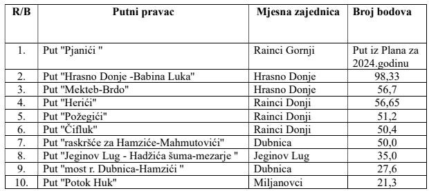 Putni pravci za asfaltiranje u 2025.godini prikazani su u sljedećoj tabeli: