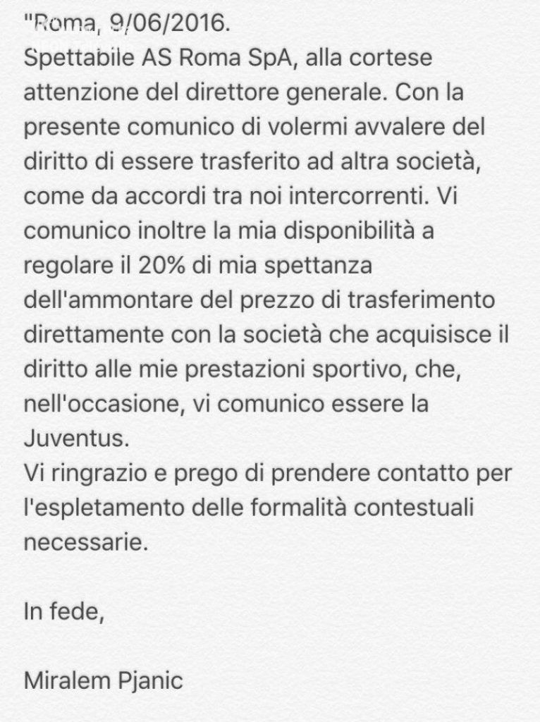 ”Obavještavam Vas da se želim prebaciti u drugi klub, kako je dogovoreno. Također Vam saopštavam da sam spreman pokloniti 20 posto od moje cijene transfera direkno klubu koji će kupiti moj igrački karton i steći pravo na moje nastupe. Ovom prilikom Vam javljam da je to Juventus. Molim Vas da stupite u kontakt s njima kako bi se završile potrebne formalnosti”, napisao je Pjanić u dokumentu koji je poslao na Rominu adresu.