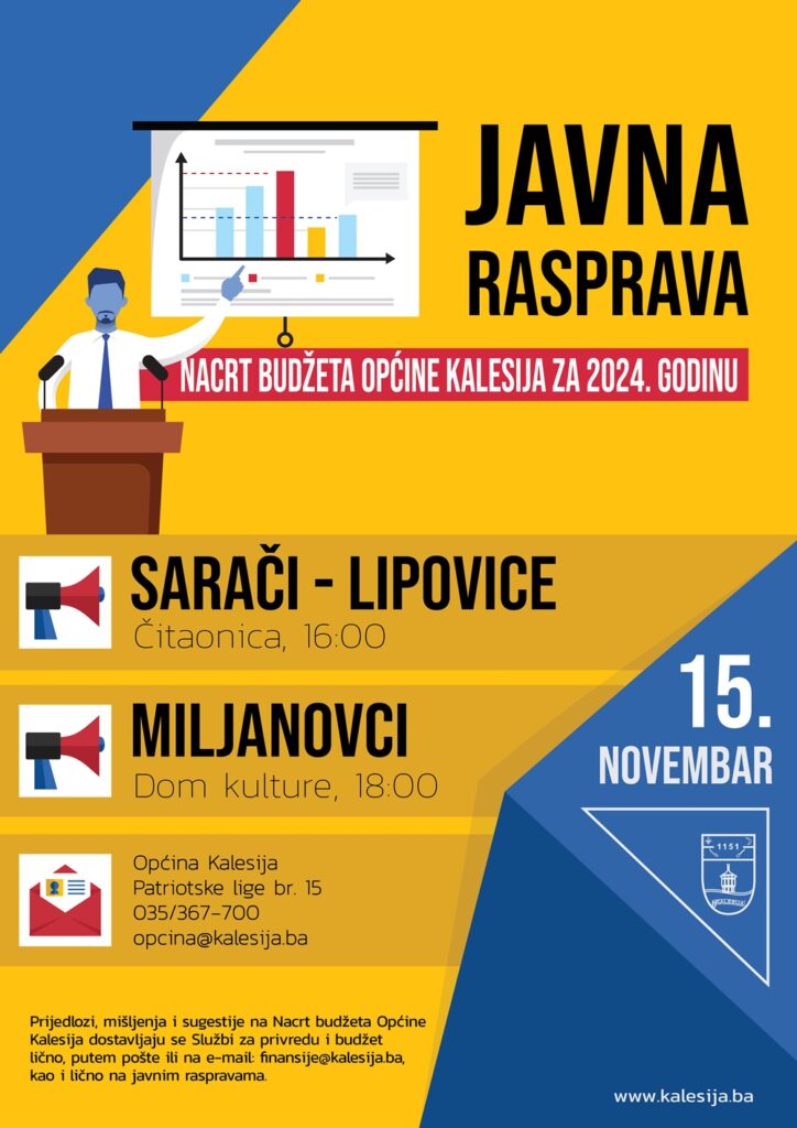 Javna rasprava o Nacrtu budžeta za narednu godinu održat će se danas u prostorijama čitaonice u Saračima za mještane MZ Sarači i Lipovice u 16:00 sati i u prostorijama Doma kulture u Miljanovcima u 18:00 sati.