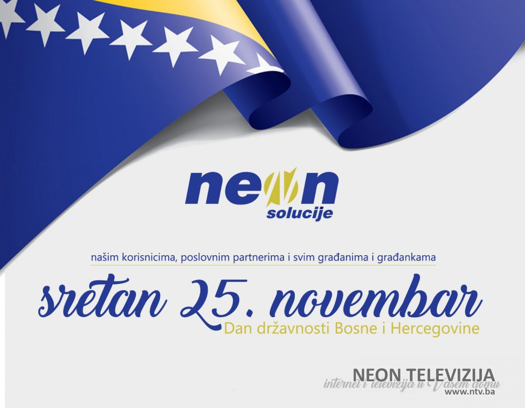 NEON Solucije i NEON Televizija korisnicima naših usluga, svim građanima Kalesije i Bosne i Hercegovine, poslovnim prijateljima želimo čestitati, 25. novembar, Dan državnosti Bosne i Hercegovine.