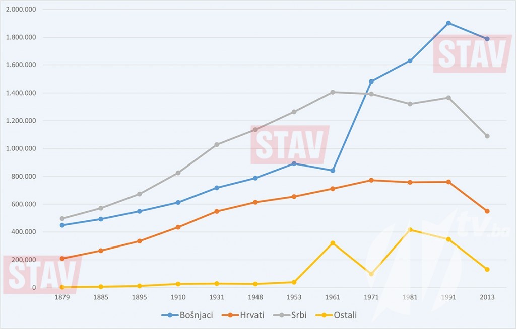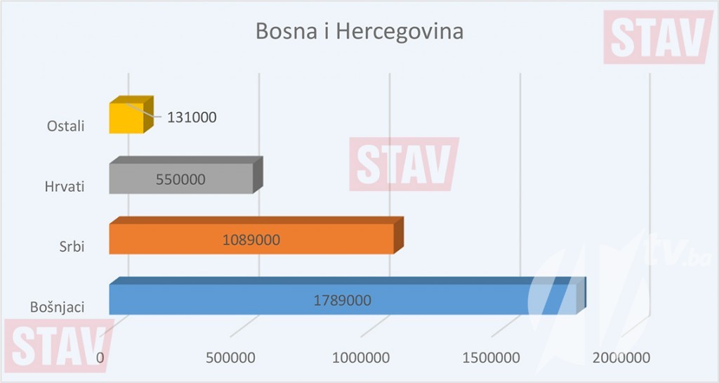 Prema podacima do kojih je došao Stav, u Bosni i Hercegovini 2013. godine živjelo je 3.559.000 stanovnika, od čega je bilo 50,24% Bošnjaka (1.789.000), 30,6% Srba (1.089.000), 15,47% Hrvata (550.000) i 3,69% ostalih (131.000). Riječ je o rezultatima po “varijanti jedan”, u vezi s kojom je postignut konsenzus između predstavnika Bošnjaka, Hrvata te Međunarodnog monitoring tima, a koje predstavnici iz Republike Srpske ne žele prihvatiti. Od ukupnog broja popisanih (3.791.662), u ovoj prvoj varijanti oduzeti su nezakonito popisani stanovnici (približno 233.000 osobe) primjenom u svijetu uobičajenih metodoloških postupaka.