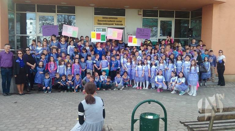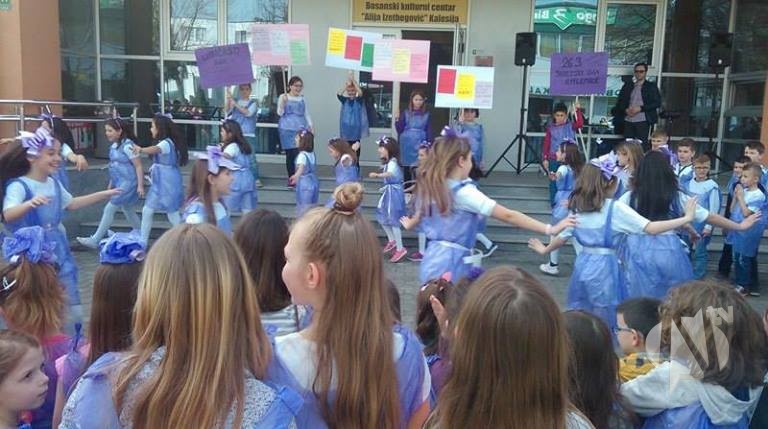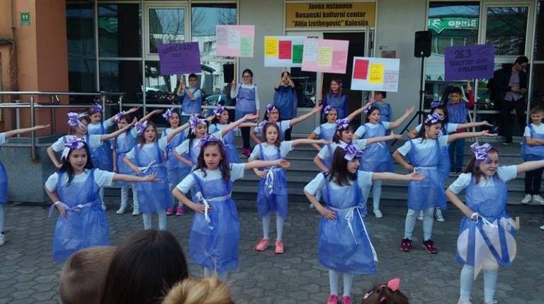 Nakon šetnje kroz centar Kalesije, učenici su sa transparentima u rukama i obučeni u ljubičasto, ispred BKC-a izveli muzički performans.