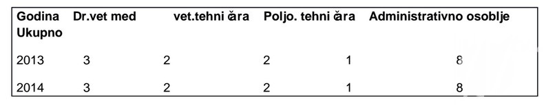 aaaaaJ.P. “Veterinarska stanica” doo Kalesija ima 8 uposlenika, a 2014. godine primila je za odrađivanje pripravničko- volonterskog staža sa završenom VSS bez radnog iskustva primila dvoje mladih ljudi i to iz oblasti ekonomije i prava. Po projektu sufinansiranja Federalnog Zavoda za zapošljavanje za rad u struci i sticanje prvog radnog odnosa i iskustva primila je tri veterinarska tehničara i jednog diplomiranog veterinara.plaćaZbog negativnog trenda u poljoprivrednoj djelatnosti iz veterinarske stanice poručuju da se nalaze u jako nepovoljnoj situaciji, zbog neisplaćenih podsticaja u stočarstvu i napuštanje stočne proizvodnje.