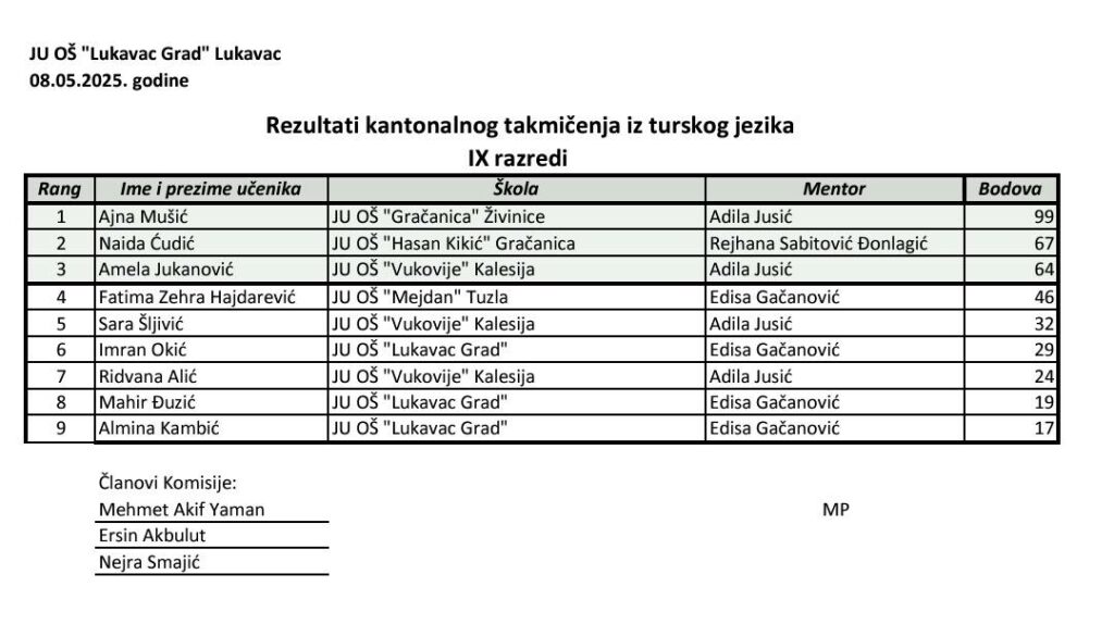 U četvrtak, 8. maja u prostorijama OŠ “Lukavac Grad” u Lukavcu održano je Kantonalno takmičenje iz turskog jezika za učenike osnovnih škola sa područja Tuzlanskog kantona.