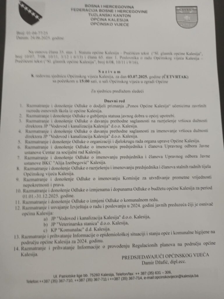 Razmatranje i usvajanje Izvještaja o radu i poslovanju u 2024. godini javnih preduzeća čiji je osnivač općina Kalesija: