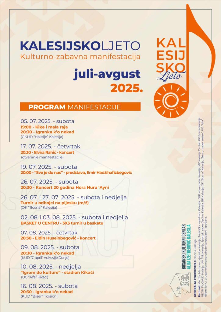 Kalesijski BKC sa partnerima i ove godine organizuje kulturno-zabavnu manifestaciju “Kalesijsko ljeto”. Organizacioni odbor je zvanično utvrdio program manifestacije koja će trajati tokom jula i augusta.