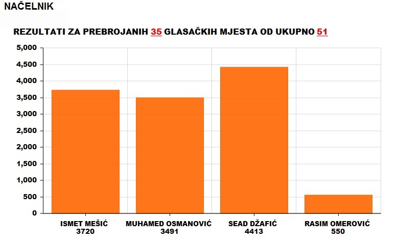 20:59- 12A Petrovice Gornje: Nakon 30 glasačkih mjesta Džafić i dalje sa ubjedljivim rezultatom 3716, Mešić 3062, Osmanović 2855 i Omerović 488.