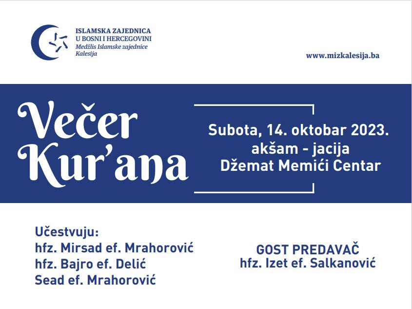 Medžlis Islamske zajednice Kalesija povodom obilježavanja rođenja Muhammeda, a.s., već dugi niz godina organizuje kulturno-vjersku manifestaciju pod nazivom Poslanik u mom srcu. U okviru mevludske manifestacije, u subotu, 14. oktobra 2023. godine, između akšama i jacije, održat će se Večer Kur'ana. Domaćin svečanosti je džemat Memići Centar.