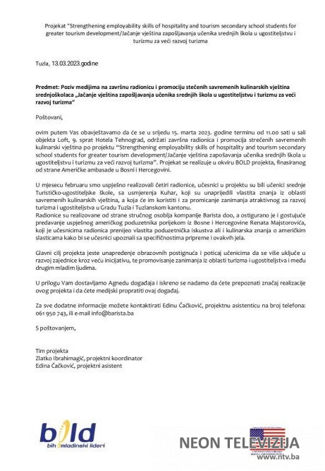 Jedan super projekat relizuje se u Turističko-ugostiteljskoj školi u Tuzli, odnosno smjer kuhar. Riječ je o projektu “Jačanja vještina zapošljavanja učenika srednjih škola u ugostiteljstvu i turizmu za veći razvoj turizma”, gdje će učenici imati završnu prezentaciju pripremljenih jela i promociju stečenih savremenih kulinarskih vještina. Ovaj projekat podržan je od strane Američke ambasade, te će učenici na meniju prezentacije jela imati i američke kolače, pored pripremljenih mesnih delicija poput ramsteka i bifteka.