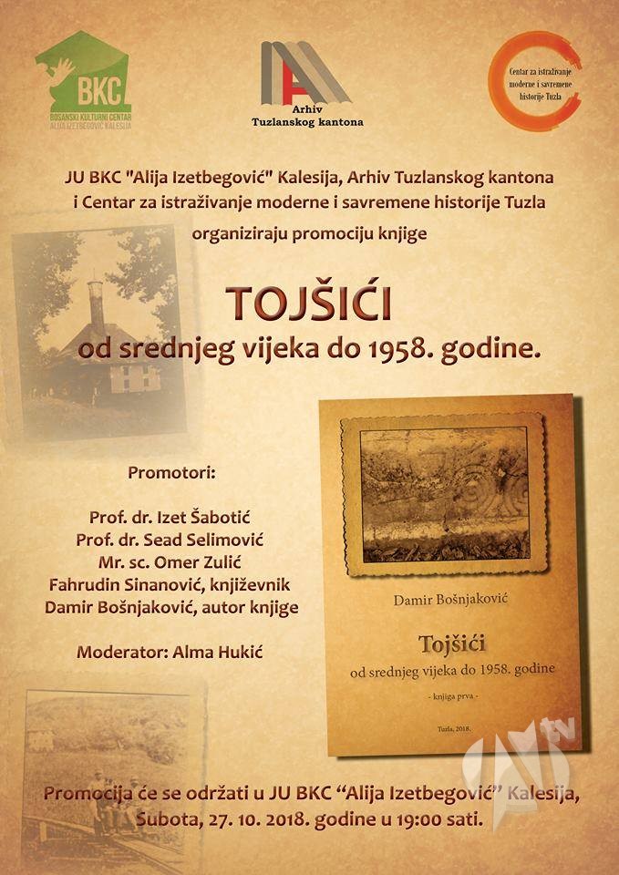 Kulturna manifestacija “Ikre 2018” kojom se u Kalesiji obilježava mjesec knjige već je počela. U okviru pomenute manifestacije u subotu 27.10.2018.godine bit će upriličena promocija knjige Promocija knjige „Tojšići od srednjeg vijeka do 1958. god.“ Damira Bošnjakovića. Promocija će se održati u kalesijskom BKC sa početkom u 19:00 sati. Promotori su prof.dr. Izet Šabotić, prof.dr Sead Selimović, književnik Fahrudin Sinanović i autor knjige Dmir Bošnjaković. Moderator Alma Hukić