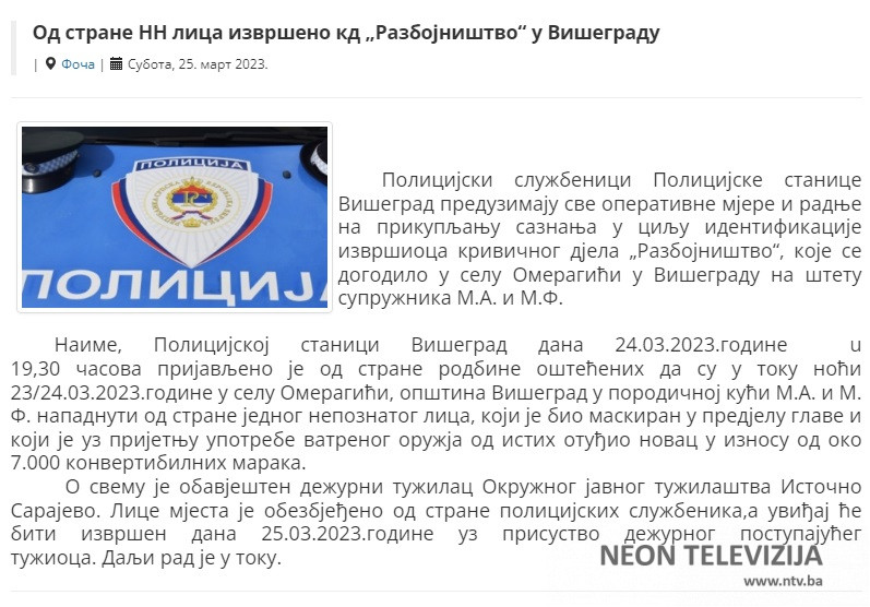 U izvještaju MUP Rs-a o navedenom događaju su danas, 25. marta, oglasili se i napisali da u Policijskoj stanici Višegrad poduzimaju sve operativne mjere i radnje na prikupljanju saznanja u cilju identifikacije izvrišoca krivičnog djela “Razbojništvo”.