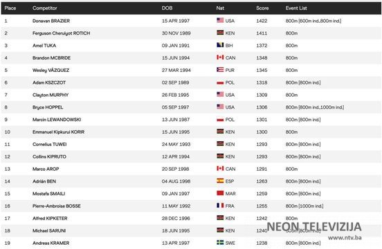 Najbolji bh. atletičar Amel Tuka zauzima treće mjesto na listi najboljih 800-metraša na svijetu prema IAAF rankingu.Na prvom mjestu je Amerikanac rođen 1997. godine – Donavan Brazier koji ima ukupni skor od 1.422 boda, dok je na drugoj mjestu Kenijac Ferguson Cheruiyot Rotich rođen 1989. godine s ukupno 1.411 bodova.