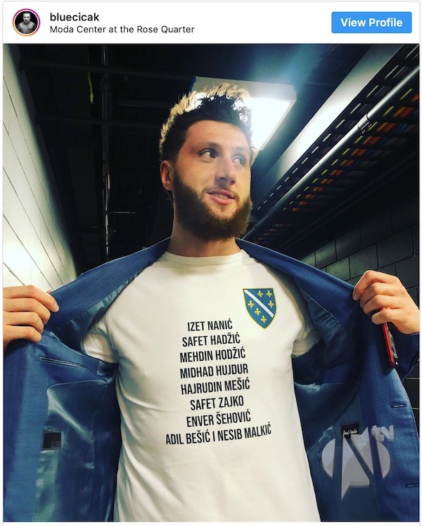 “Zanimljvo je da je tokom meča bosanskohercegovački košarkaš, član Portlanda, Jusuf Nurkić (koji ne igra zbog teške povrede)obukao majicu sa imenima poginulih vojnika iz ratova devedesetih, koji u bošnjačkoj javnosti imaju status heroja, a koji su ratovali protiv Srba. Zanimljivo je da na početku utakmice nije pokazivao majicu jer je imao preko duks, ali je tokom meča skinuo”, pišu beogradski mediji. Njima je pored spomenute majice sa imenima devet heroja Armije R BiH zasmetalo što je Nurkić na svom Facebook profilu postavio snimak ilahije “Devet heroja”.