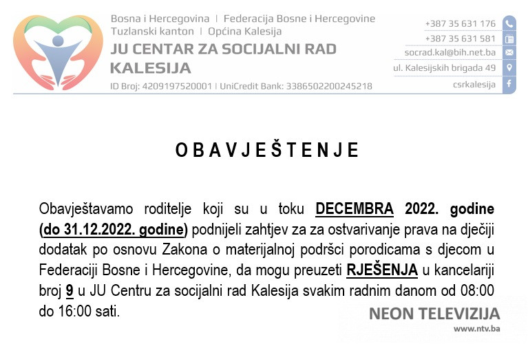 JU Centar za socijalni rad Kalesija obavještava roditelje koji su u toku decembra 2022. godine (do 31.12.2022. godine) podnijeli zahtjev za ostvarivanje prava na dječiji dodatak, da Rješenja mogu preuzeti svakim radnim danom od 8:00 do 16:00 sati.