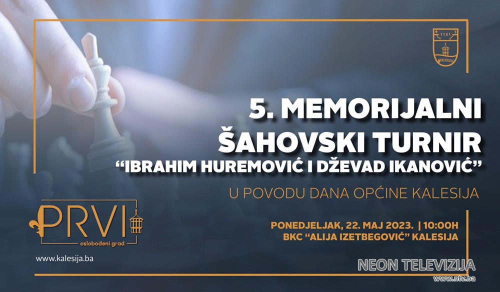 Peti memorijalni šahovski turnir „Ibrahim Huremović i Dževad Ikanović“ igra se u ponedjeljak 22.maja u sa početkom u 10:00 sati u prostorijama Bosanskog kulturnog centra „Alija Izetbegović“ Kalesija.