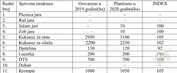 U 2020 godini realno se planira proljetna sjetva sa površinama i kulturama navedenim u sledećoj tabeli a na bazi ostvarenja iz 2019 godine.