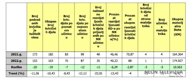 U toku 2022.godine, u odnosu na prethodnu godinu, evidentirano je smanjenje krivičnih djela protiv imovine za 10 krivičnih djela ili 10,20%, zatim smanjenje krivičnih djela protiv života i tijela za 9 krivičnih djela ili 40,90%, smanjenje krivičnih djela protiv slobode i prava čovjeka i građanina za 3 krivična djela ili 50%, smanjenje krivičnih djela protiv zdravlja ljudi za 2 krivična djela ili 18,18%, smanjenje krivičnih djela protiv pravosuđa za 2 krivična djela ili 200% i smanjenje krivičnih djela