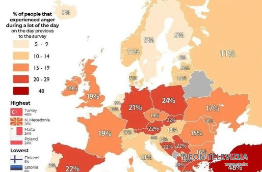 Prvo mjesto zauzela je Turska, gdje 48 posto stanovništva svakodnevno ispoljavaju određenu količinu bijesa. Na drugom mjestu nalaze se Sjeverna Makedonija sa 26 posto stanovnika koji osjećaju ljutnju tokom svakog dana. Slijede ih države Malta i Poljska s 24 posto.