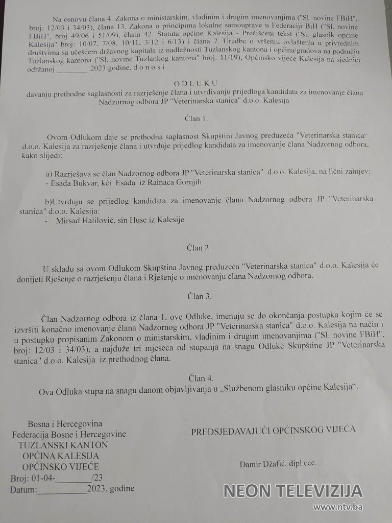 Odluka o raspisivanju Javnog oglasa za imenovanje prijedloga kandidata za predsjednika i člana NO JP Veterinarska stanica d.o.o. Kalesija čiji je osnivač općina Kalesija je usvojena jednoglasno.