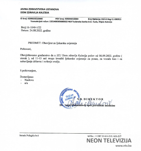 Obavještvamo građanstvo da u JZU Dom zdravlja Kalesija počev od 06.09.2022. godine (utorak), od 11 – 15 sati mogu izvaditi ljekarsko uvjerenje za posao, za vozače kao i za nabavljanje državne i nošenje oružja.