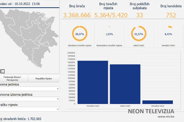 Centralna izborna komisija Bosne i Hercegovine je danas objavila ažurirane rezultate izbora za sve nivoe. U odnosu na prethodno ažuriranje nije bilo većih promjena te je uglavnom dodat određeni broj glasova poštom.