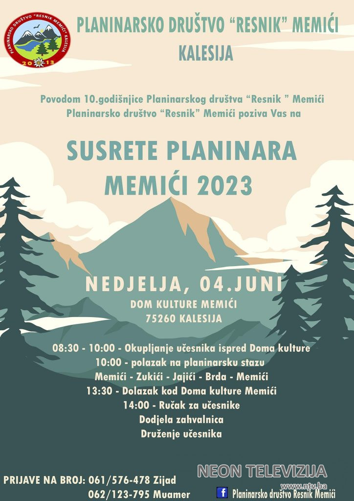 Planinarsko društvo “Resnik” Memići poziva sve ljubitelje prirode, planinare na Susrete planinara “Memići 2023”, a koje organizuju povodom 10. godišnjice postojanja ovog društva.