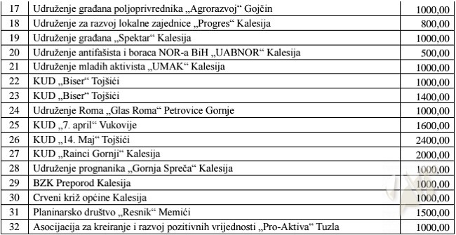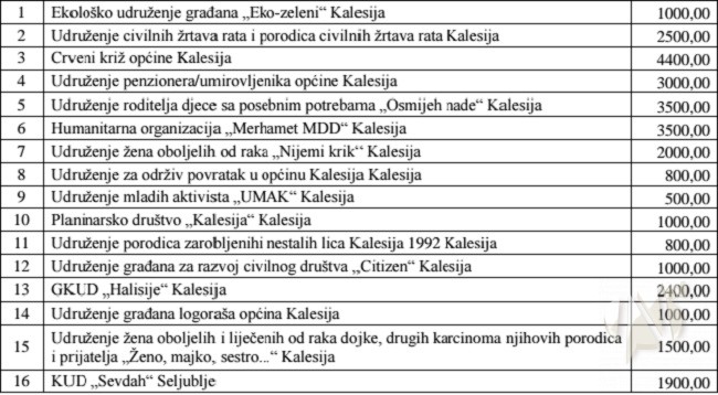 Na osnovu člana 13. Pravilnika o utvrđivanju postupka i kriterija za dodjelu sredstava na ime podrške projektima iz oblasti društvenih djelatnosti organizacijama civilnog društva na području općine Kalesija (“Sl. glasnik općine Kalesija” br. 3/17), Rukovodilac Službe za opću upravu, boračko-invalidsku zaštitu i raseljena lica, nakon raspisanog Javnog poziva, donio je Program raspodjele sredstava na ime podrške projektima iz oblasti društvenih djelatnosti organizacijama civilnog društva na području općine Kalesija u 2017. godini, a Općinski načelnik je donio Odluku o usvajanju Programa br. 02-14-1662-3/17 od 25.04.2017. godine.