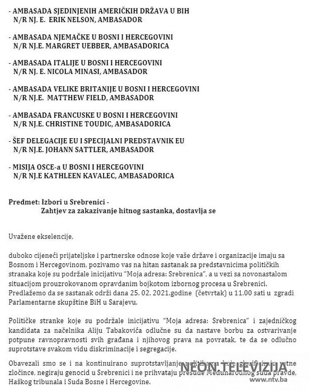 Oni od stranih ambasada u BiH traže hitan sastanak za 25. februar u 11 sati, a “u vezi sa novonastalom situacijom prouzrokovanom opravdanim bojkotom izbornog procesa u Srebrenici”.