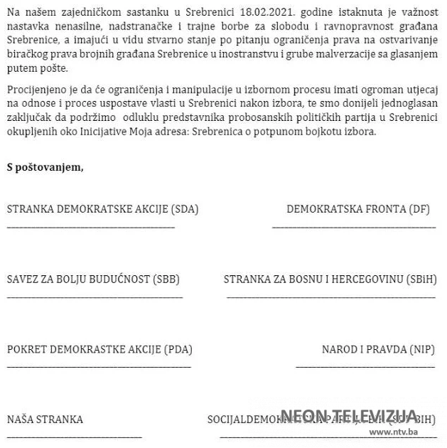 “Političke stranke koje su podržale inicijativu ‘Moja adresa: Srebrenica’ i zajedničkog kandidata za načelnika Aliju Tabakovića odlučne su da nastave borbu za ostvarivanje potpune ravnopravnosti svih građana i njihovog prava na povratak, te da se odlučno suprotstave svakom vidu diskriminacije i segregacije”, navodi se u zahtjevu.