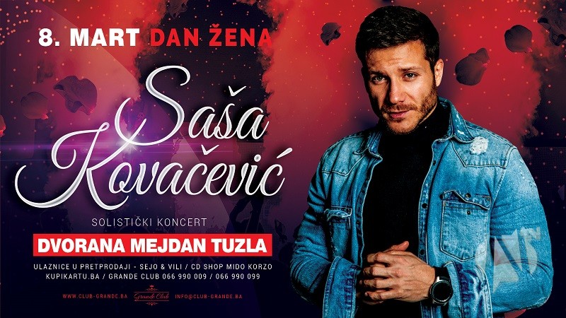 Jedan od najpopularnijih muzičara mlađe generacije na našem govornom području, Beograđanin Saša Kovačević romantičnim će hitovima uljepšati proslavu 8. marta u Tuzli. Na Dan žena ovaj pijanista, dizajner zvuka zemunske Akademije umetnosti i pjevač, nastupit će u velikoj dvorani Mejdana.