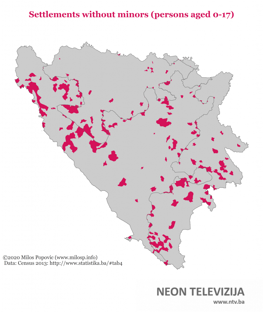 Mapa pokazuje poražavajuću brojku- čak 8% svih katastarskih naselja nemaju ni jednog maloljetnika. Riječ je o 804 naselja koja ulaze u sastav preko 90 opština ili grada u Bosni i Hercegovini, a prema podacima koje je BUKA dobila od Popovića najlošija situacija je u opštini Višegrad gdje čak 62 mjesta nemaju ni jednog maloljetnika, potom slijedi Trebinje (53), Rogatica (41), Goražde (38), Konjic (35), Rudo (33), Sokolac (32), Foča (31) …