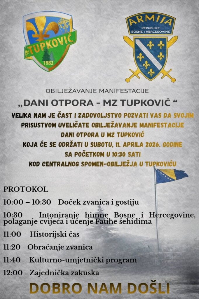 Tradicionalna manifestacija „Dani otpora – MZ Tupković“ bit će obilježena 11. aprila, s početkom u 10:30 sati, kod centralnog spomen-obilježja u Tupkoviću.
