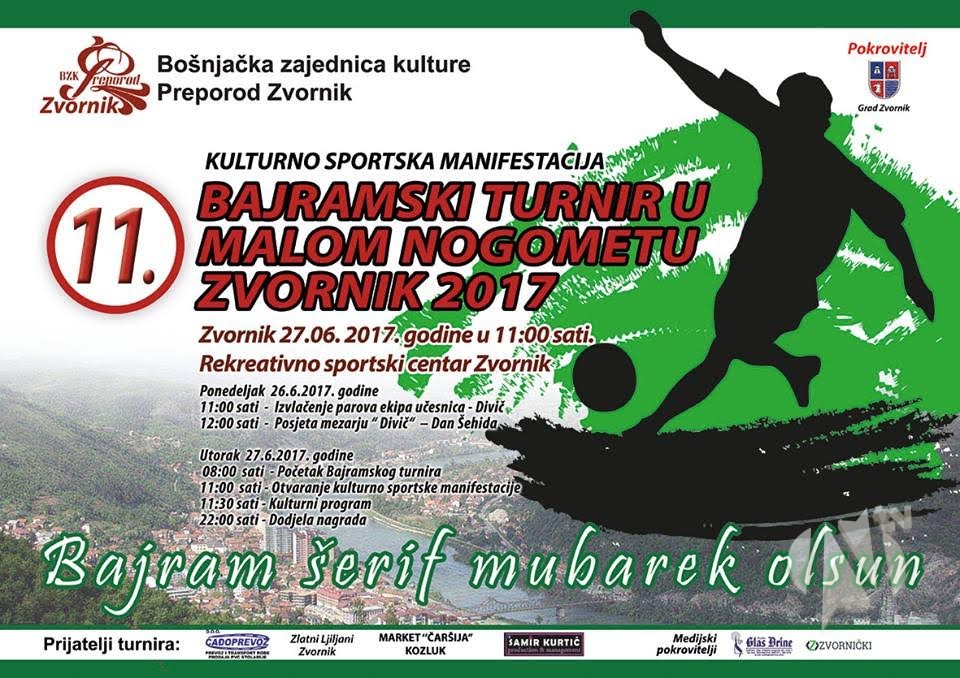 Bošnjačka zajednica kulture „Preporod“gradsko  društvo Zvornik organizirai ove godine kulturno – sportsku manifestaciju 11. bajramski malonogometni turnir. Turnir će biti održan u Sportsko – rekreativnom centru u Zvorniku, drugog i trećeg dana Ramazanskog Bajrama, u ponedjeljak i utorak, 26. i 27. juna 2017. godine.