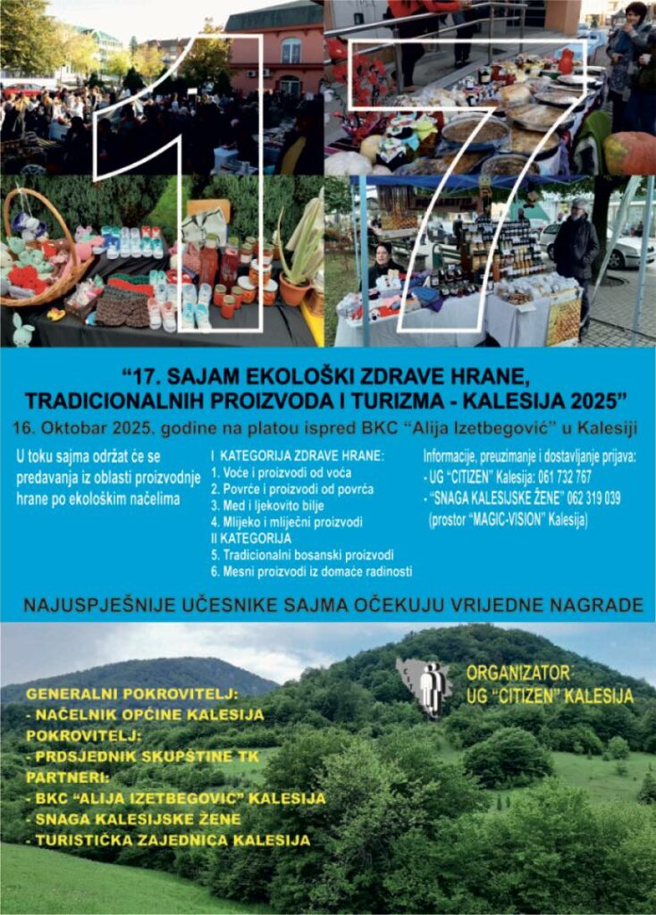 U organizaciji UG Citizen i Udruženja Snaga kalesijske žene Kalesija, u četvrtak, 16. oktobra na platou ispred BKC-a “Alija Izetbegović” bit će održan “17. sajam ekološki zdrave hrane, tradicionalnih proizvoda i turizma”.
