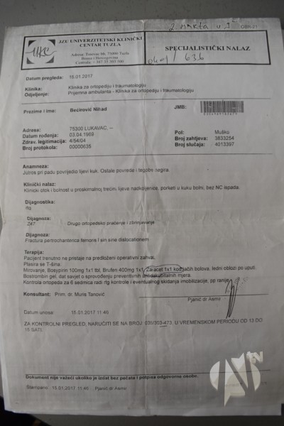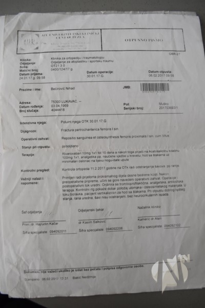 Nihadu Bećiroviću iz lukavačkog naselja Dobošnica, potreba je pomoć dobih ljudi. Živi sam, sa mjesečnim primanjima u iznosu od 300 KM. Prošle godine operisao je kuk, na UKC Tuzla. Operativni zahvat koštao je 1780 KM, od čega je Zavod za zdravstveno osiguranje uplatio 500 KM, a ostali dio novca Nihad nije bio u mogućnosti isplatiti.