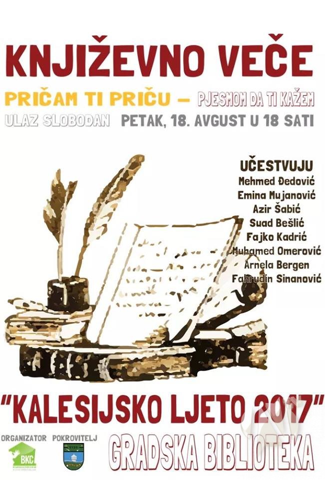 U okviru manifestacije “Kalesijsko ljeto 2017”  večeras sa početkom u 18:00 sati održat će se književno veče “Pričam ti priču-pjesmom da ti kažem”.